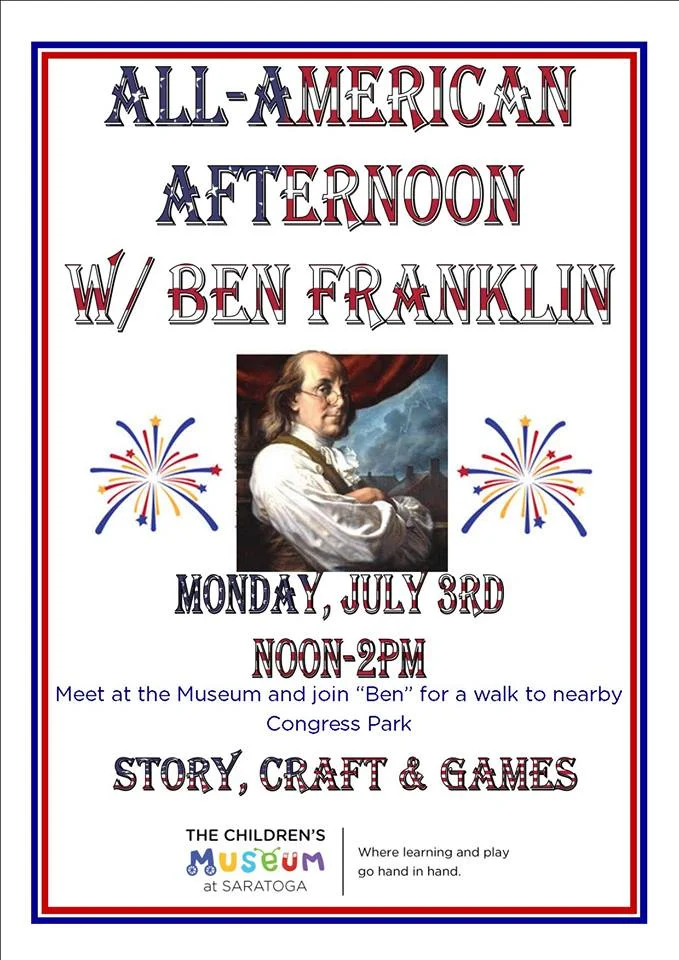 Join The Children's Museum at Saratoga on Monday, July 3rd for their All-American Afternoon with Ben Franklin as they parade from the museum to Congress Park lead by "Ben Franklin" for a story, a craft, and some Colonial Games. Bring your own picnic lunch or snack to enjoy while listening! Taking place from 12-2pm on Monday, July 3rd.