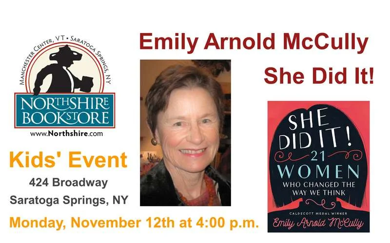 Join Northshire Bookstore on Monday, November 12th at 4:00 p.m. to learn about 21 women who changed the way we think. Caldecott Medalist Emily Arnold McCully will be reading from and discussing her book She Did It!